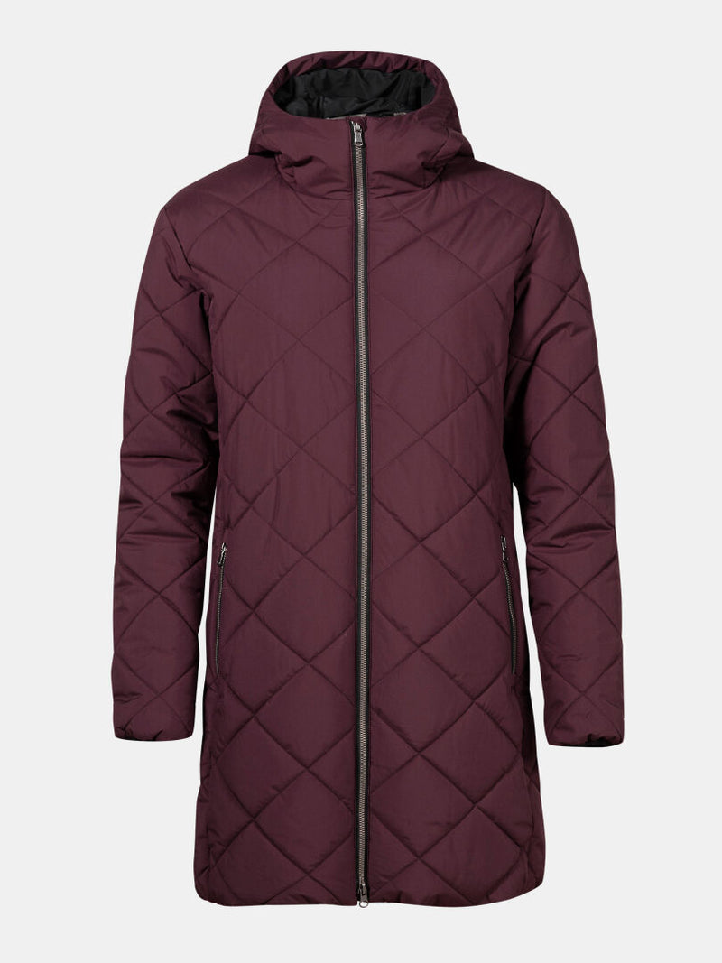 Der Halti Haapa Steppmantel Damen Plus ist ein langer, kastanienbrauner Mantel mit Kapuze, Frontreißverschluss und Reißverschlusstaschen.
