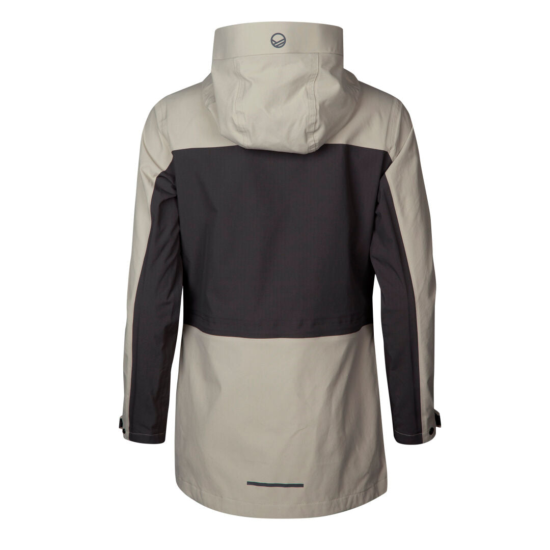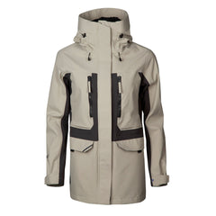Die Halti Kallas DX Parka Jacke Plus Damen ist ein cremefarbener, wasserdichter Parka mit langen Ärmeln, Kapuze und verstellbaren Bündchen.