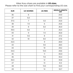 Die Hiker Kuru-Schuhe sind in US-Größen erhältlich. Bitte schaue in die Größentabelle, um deine entsprechende US-Größe zu finden.
