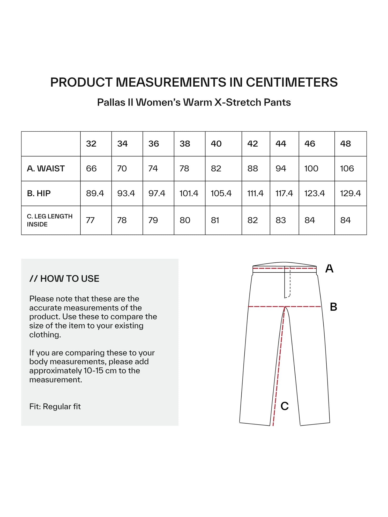 Am besten vergleichst du die Maße mit einem ähnlichen Teil, das dir gut passt.