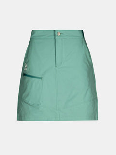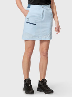 Halti Pallas Damen Lite X-Stretch Rock: Hellblaugrün, knielang, schnelltrocknend, Reißverschlusstasche vorne, Knopfverschluss.