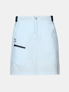 Halti Pallas Damen Lite X-Stretch-Rock in Hellblau mit Knopf vorne, Reißverschlusstasche und schwarzem Logo oben links.