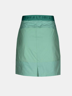 Hellgrüner Halti Pallas Damen Lite X-Stretch Rock, dunkelgrüner Bund, schnelltrocknender Stoff, einfarbiger Hintergrund.