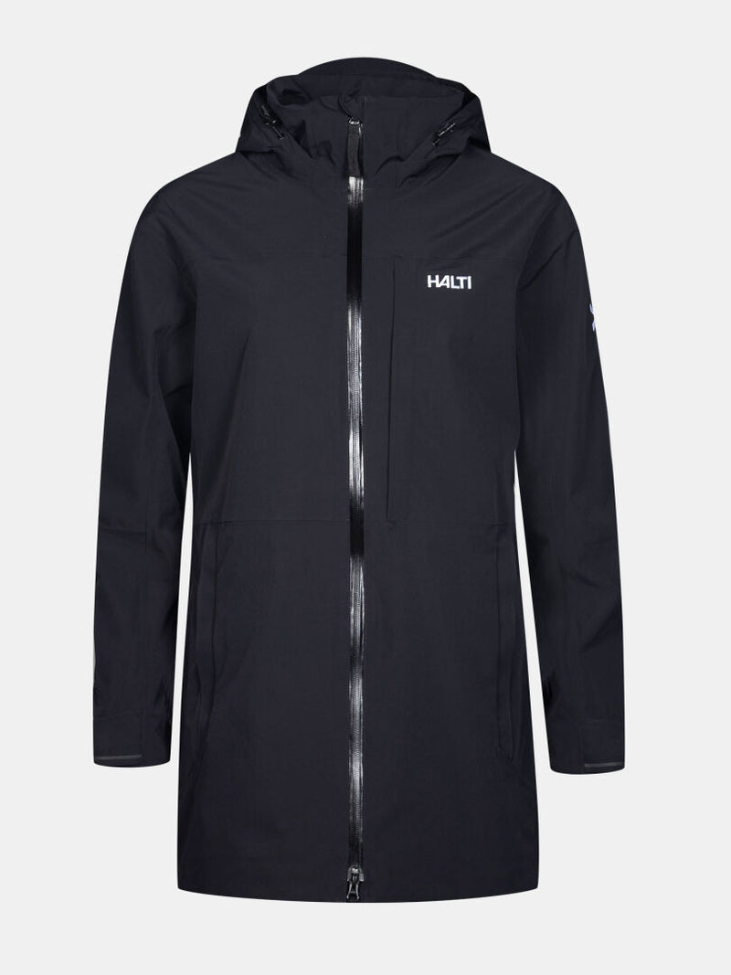 Die Valaja DX Parkajacke Damen von Halti ist eine schwarze, wasserdichte Outdoorjacke mit Frontreißverschluss und Logo.